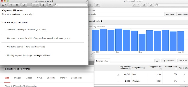 Don't know how each of you go about finding keywords and key phrases, but here is how I do it. Notice that this is specifically for Google. If you have better methods, please share them. 1. Go to Google Keyword Tool and search got relevant keywords. 2. Look for keywords that have been searched often. I have found that the competition information within the Google Keyword Tool isn't very effective. However, the other info is very useful. You can use this tool to find good alternative keywords and generate different ideas. 3. Head to Google search, after selecting a few frequently searched keywords. Search: allintitle:"your keyword". Be sure to put your keyword in the "your keyword" spot. (Duh. ). After this check out the total number of results. You'll have more trouble ranking with keywords that have a high number of results. Therefore, you're better off choosing keywords that result in fewer matches. I am no expert, but I assume this would also translate to Bing. I also find myself using the Original Wordtracker to come up with different words and phrases. It provides much of the same information that the Google Keyword tool does. Once you've found some potential keywords, be sure to use them in your content, header, image and meta tags. You'll also need to build back links using these keywords. Anybody else use this same method or would like to expand on it?