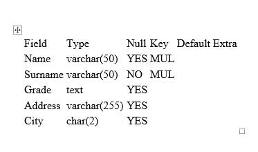 That "key" with "mul" for name and surname... is that a multi column primary key? Always have an id for your primary name + surname is flawed because you will have people with the same name people change their surname on marriage people change their first names - William becomes Bill, people switch to using their middle names I appreciate that concerns about name + surname are based on anglo culture and I know little about Algeria but I am aware of the Muslim tendency to call boys Mohammed something - the spelling seems to have many variations but it increases the probability of duplication.