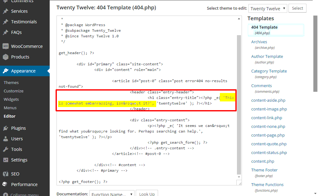I want to customize the yellow highlighted text in screenshot for my 404.php template but that text doesn't appear currently on my 404 pages like this one: https://danscartoons.com/tooner and wonder how I can get that to show up on the published page. Does anyone know how? See screenshot. Thanks
