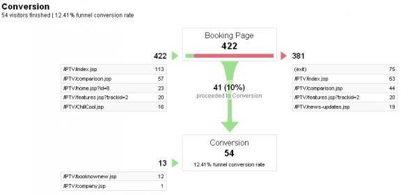 I tried to find the solution to my problem by reading different questions posted here but I guess only an with my specific details will help me understand the issue. I have setup the goals for booking/lead on my site. It is simple one step booking where customer opens my booking page(/IPTV/booknownew.jsp), Fills the form, submit and get confirmation page(/IPTV/confirm_Booking.jsp). When I check the Funnel Visualization I see the details as shown in image (result.gif). Now as I understand here is that booking page(/IPTV/booknownew.jsp) gets 422 visitors from various pages out of which only 41 pass through on conversion page. but then there are 13 more being added (making total to 54) from /IPTV/booknownew.jsp and /IPTV/company.jsp. What I do not understand is 1. /IPTV/booknownew.jsp is my booking page thus why people coming from this page are not added in my first page visitors (422) 2. There is no booking form on /IPTV/company.jsp then how come any user come from this page to conversion page Can someone help please? your help will be greatly appreciated. I have attached two images with it which show the setting of goal and the result funnel visualization.