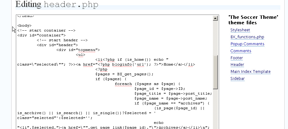 I have looked for a plugin but could not make heads or tails of which one is the right one or if it is one at all. The descriptions on some are woeful. Syntax is quite different in mine. I'll post a snippet of the code down to the header: body { background:#fff url(images/bgbody.jpg) repeat-x top left; font-size: 11px; font-family: Verdana, Arial, SunSans-Regular, Sans-Serif; padding:0px; margin:0px; } ol,ul,form,p,h1,h2,h3,h4,fieldset{margin:0; padding:0;} a{text-decoration:none; color:#000;} /* ----------container zentriert das layout-------------- */ #container { width: 735px; margin-bottom: 10px; margin-left: auto; margin-right: auto; } /* ---------- header -------------- */ #header { padding: 0px; margin: 0px; height:211px; position:relative; } #imgsoccerball{position:absolute; bottom:0; left:0; background:url(images/soccerball.jpg) no-repeat; width:159px; height:143px;} html > body #imgsoccerball{bottom:1px;} /* because ie */ #topmenu{height:25px; padding-top:5px; background:#000;} #topmenu li{float:left; list-style-type:none; padding:3px 10px 3px 10px; border-right:solid 1px #fff;} #topmenu a{text-decoration:none; color:#BBDAE0; font-weight:bold;} #topmenu a:hover{color:#FF9900;} #titlesite{text-align:center; margin-top:10px;} #titlesite h1{font-size:35px; font-weight:bold;} #titlesite h2{font-size:18px; color:#FF9900;}