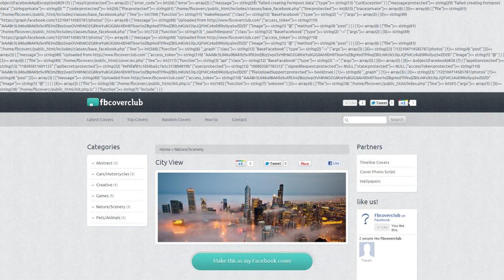 Hi guys, I bought this facebook cover script that allows user upload cover images to their facebook album so they can set that image as their timeline cover straight away(demo). Because the script have no support at all (very dodge people behind), I can only ask you guys to help me fix the bug. It's not a big issue, but very annoying, if you are familiar with php and facebook api, maybe you can fix it in 30mins The issue is when click the upload button to upload image to facebook, it popup error message(see the screenshot), it only happened to one image now, the others work fine. if you are interested in this job please PM me for details, thanks in advance~! oh, yes, I'm willing to pay $50 on this if you fixed it.