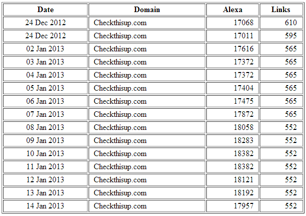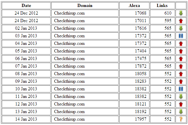 I'm not seeing it here, but where are you storing the old rank vs. the latest? If you don't have the number from the previous update stored, how can you know if it went up or down? * SIDE NOTE * -- what's with the CENTER tags doing align's job, TD, CENTER and B doing TH's, job, non-breaking space's doing padding's job, single TD tables for nothing, invalid placement of an anchor inside a TR, mismatched/broken widths (600 inside a 300?), mere presence of tags like FONT and CENTER that have no business in HTML written after 1998, and in general decade and a half out of date HTML methodology? Just saying...