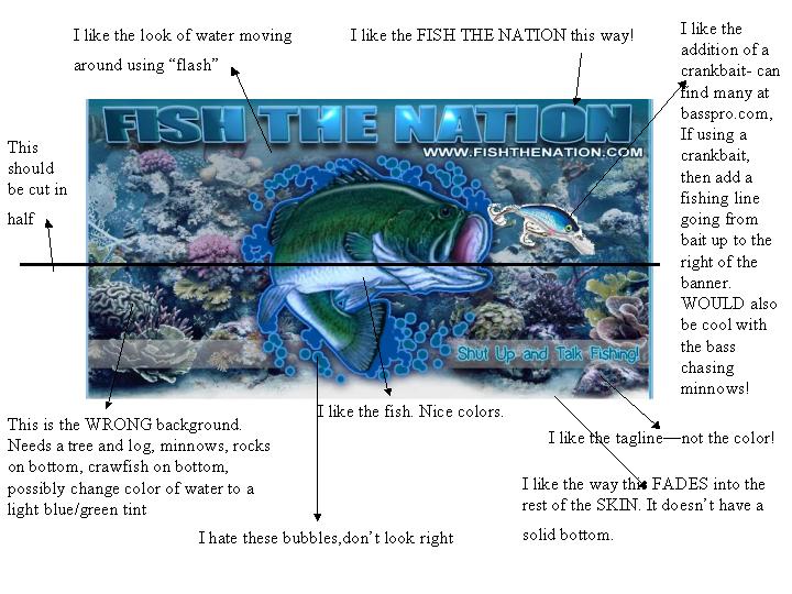 This is still open. I'm not sure if the attachment from above can be opened or not? as I've had a few folks tell me they couldn't see it larger. I've attached it again here. It displays something which was done for me....but with my notes on how I'd like to see it differently. I need someone whom knows FLASH and can but together a nice Banner for the header of my vBulletin Site. Understanding freshwater fishing is also a benefit. Please contact me here or at