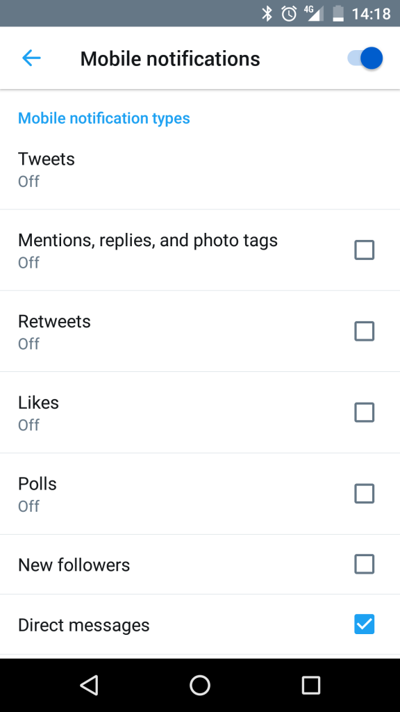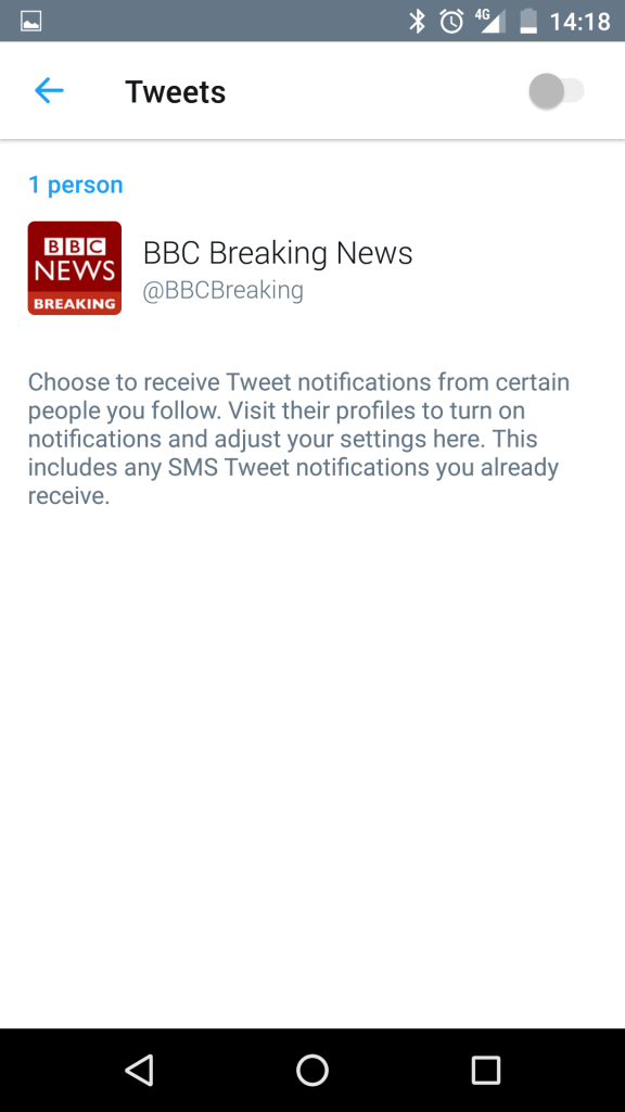 Hi guys new here , have been looking through the forum but cant seem to find the answer. I am trying to enable notifications , which have been working fine up until today. If you see the attached images i have mobile notification types on at the top right but tweets are set to off and when i drill into it ( 1st image image ) its greyed out so am not receiving notifications. its android app. I have uninstalled it twice and also revoked access via pc and reinstalled but cannot seem to chan ge it. any ideas guys please many thanks