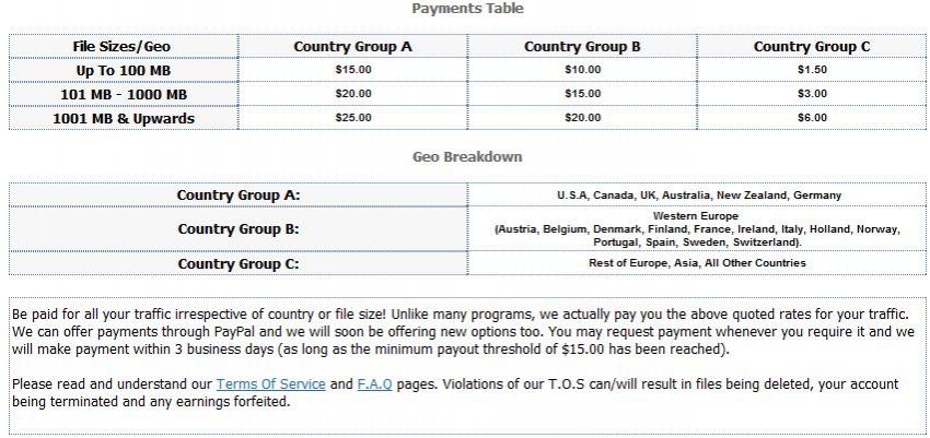 Pay-Per-Downloads - Earn Up To $25.00 Per 1,000 Downloads With Our Affiliate Program We offer a genuine Pay-Per-Downloads affiliate program that rewards you for your quality traffic. Here`s how it works: Get Paid When Your Files Are Downloaded! Checkout our affiliate program. 3 Options to choose from: 1- 90% PPD 2- 50% PPD +25% from premium sales 3- 50% from premium sales Be paid for all your traffic irrespective of country or file size! Unlike many programs, we actually pay you the above quoted rates for your traffic. We can offer payments through PayPal and we will soon be offering new options too. You may request payment whenever you require it and we will make payment within 7 business days (as long as the minimum payout threshold of $15.00 has been reached). Please read and understand our Terms Of Service and F.A.Q pages. Violations of our T.O.S can/will result in files being deleted, your account being terminated and any earnings forfeited. For more info, check our on-going affiliate thread on WJunction. <-- Also Check how many people we have been paying on time. [mods please let me know if there is a problem with my posting. I will immediately correct any rules I have followed. I do not wish to violate any digitalpoint's rules. thanks]