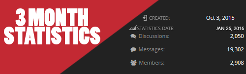 *I guess no one likes me * I joined Aug 22, 2012... However, this is my first ever post XD I've been a webmaster since Apr 10, 2009. I've just had a site of mine get extremely popular, and after having a staff member on FP tell me I should write an article on the success of my site even though it's only 4 months old I decided to join and be active on other webmaster forums. I personally don't think the statistics are all that great, but she said they were outstanding for the fact that my forum isn't even 4 months old yet (Though it's coming up on it's 4 month mark). Here are the statistics as of the 26th, though the current statistics are: Discussions: 2,075 Messages:19,620 Members: 2,943 If you'd like to ask me anything feel free to do so I try to be an open book, and answer everything I possibly can.