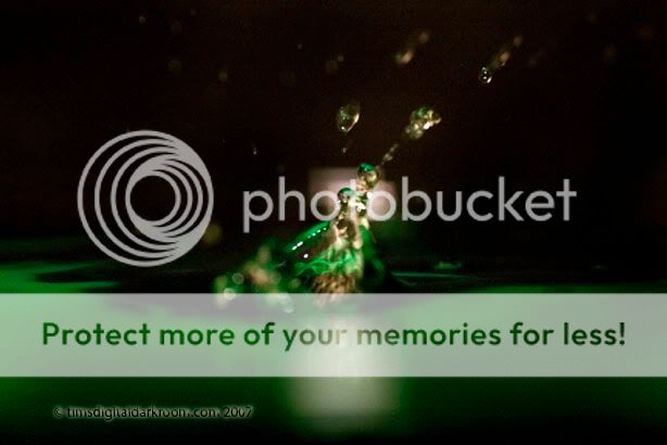 Canon Digital Rebel XTi, 24-105/4L lens, Sigma DG 500 Flash The faster the camera the better. The XTi can shoot 3fps up to 10 shots (RAW) before the buffer fills. The hardest part was figuring out something that would continuously drip water into a pool. Some people I know have just used their kitchen sink! Makes sense, that way you have control over the faucet. I fiddled around several times before I took a water bottle, inverted it, and crudely mounted it to a stand by which it would release the water and fall into a clear pyrex glass bowl. Then you pretty much have to guess on the focus, figure out where the drops will land and try and position the lens to focus on that point(using manual focus)...I sometime use my finger to get a point of reference. The idea then with the camera setting is to get the shutter speed very high to freeze the action. I think I was using 1/320s or 1/400s. IN order to do that you need a vary large Aperture (Small F#). The lens I was using only goes to F/4. The trade off with a large aperture is that you will get a shallow DOF (Depth of Field) and so it might not render the entire scene in focus. I also use a external flash set manually to 1/128th power to ensure I can get it to fire 10 times in 3 seconds. Once the water is dripping I use a wired remote to actuate the shutter, set the motor to continuous drive and let it fire off 9-10 shots in a row. Obviously the setup, control, and pretty much the entire process is heavily driven by trial and error. Like trying to capture lightning, you might only get 1 good shot out of 10. ____________________________ questions?