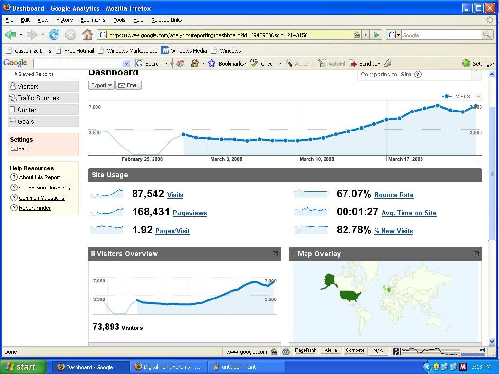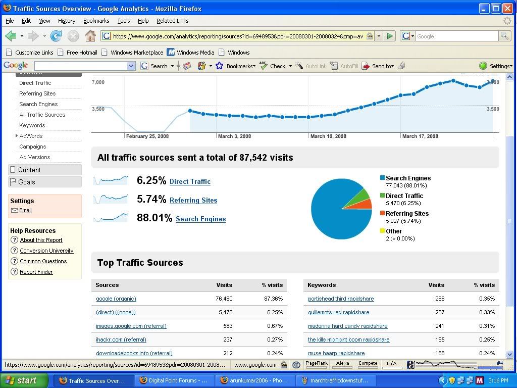 Why pay for 10000 impressions from same 100 visitors ? If same visitor see same ad again and again , then clicks will be from same person means no fresh conversion. But here is a great offer: You will not get this offer from any adnetwork but here, coz you have to pay only for unique visits not for reoccurring impression by same visitor during a month. That means if your ad is being seen by same visitor within 30 days it will not be counted. Size: Over 25000 pages. Site theme: entertainment, music, movies. Traffic quality: From USA and other European countries. Ad spots : above the fold, maximum two 125*125 buttons or a 160*600 banner in right sidebar. Price: 1. for 125*125 button: $0.15/1000 unique visits ( minimum purchase is 100000 UV) 2. for 160*600 banner: $0.30/1000 unique visits (minimum purchase is 100000 Uv) Why i am selling so cheap: coz my invoices are up and i need some money in paypal quickly. Traffic snapshot of this month from analytics: http://i204.photobucket.com/albums/bb41/arunkumar2006/marchtrafficdownstuffz.jpg Mostly traffic from search engine that means i diden purchased traffic to show my stats high. Snapshot from analytics attached: http://i204.photobucket.com/albums/bb41/arunkumar2006/marchsearchtrafficdownstuffz.jpg Site is getting around 6000UV/day . Alexa ranking snapshot: http://i204.photobucket.com/albums/bb41/arunkumar2006/marchalexadownstuffz.jpg