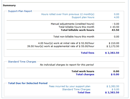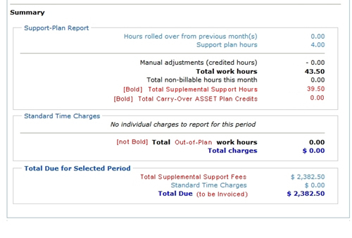 Hey all, I have a CRM system that I am using and I would like to know if someone could help me with a small issue ... In the attached files, you will see the screen as it is now (Summary-Current.jpg) nd how I would like it to look (Summary-Preferred.jpg). I have the new layout done, with everything in place, but I can't get the Total Carry-Over ASSET Plan hours to calculate. I made some changes in the profile_timecharges.php file which now looks like this: <?php if( !($year = getNData('year') ) ) $year = date( "Y" ); if( !($month = getNData('month') ) ) $month = date( "m" ); $c = Customer::factory( Engine::userLoggedIn() ); $s = $c->getTimechargeSummary( $year . "-" . $month ); ?> <style type="text/css"> fieldset.tc{ -moz-border-radius:5px; border:1px solid #CCCCCC; color:#267DDC; margin:5px; padding:10px; } .ntext{ color:#000000; } .total { color: #0000FF; font-weight: bold; } </style> <script type="text/javascript"> function updateQuery(){ profile_panel.body.load({ url: 'index.php', method: 'post', scripts: true, params: { tsrc: 'profile_area', subsection: 'profile_timecharges', year: Ext.get( 'year' ).getValue(), month: Ext.get( 'month' ).getValue() }, callback: function( oElement, bSuccess, oResponse ){ if( !bSuccess ) updateQuery(); } }); } </script> <div id="content-panel"> <div id="content" style="padding-top:15px;padding-right:10px;"> <div class="text"> <div style="margin:5px;vertical-align:middle;" class="text"> View report for <label> <input name="year" type="text" id="year" size="4" maxlength="4" value="<?= $year ?>"> </label> / <label> <input name="month" type="text" id="month" size="2" maxlength="2" value="<?= $month ?>"> </label> <input name="submit" type="submit" onclick="updateQuery();"> <hr> <h2>Time charges for <?= date( "F Y", strtotime( "$year-$month-01 00:00:00" ) ); ?></h2> <? if( $s['work'] ): foreach( $s['work'] as $w ): ?> <table width="550" border="0" cellpadding="5" align="center" style="padding:5px;margin-top:10px;"> <tr> <td width="65%" valign="top"><h3><?= $w->subject ?></h3> <? if( $w->topic_id ): ?> (ref ticket #<a class="text" href="index.php?linkact=st&i=<?= $w->topic_id ?>" target="_blank"><?= $w->topic_id ?></a>)<br> <? endif; ?> <? if( $w->out_of_plan ): ?> <i>not covered by support plan</i><br> <? endif; ?> <? if( $w->type == 2 ): ?> <i><span style="color:#00DD00;">credit</span></i><br> <? endif; ?> </td> <td width="27%" valign="top" style="color:#0000FF;"><h3><?= $w->type_string ?></h3></td> <td width="8%" valign="top"> <h3 align="right" style="color:<? if( $w->type == 2 ): ?>#00DD00<? else: ?>#000000<? endif; ?>;"><?= $w->hours ?></h3> </td> </tr> <tr> <td style="color:#006699;"><?= $w->admin_name ?> - <?= $w->verbose_date ?></td> <td> </td> <td> </td> </tr> <tr> <td colspan="3"><?= $w->comment ?></td> </tr> </table> <? endforeach; else: ?> <table width="550" border="0" cellpadding="5" align="center" style="padding:5px;margin-top:10px;"> <tr> <td>No tasks are recorded for this time period</td> </tr> </table> <? endif; ?> <br> <hr> <h2>Summary</h2> <? if( $s['plan'] ): ?> <fieldset class="tc"> <legend>Support-Plan Report </legend> <table width="550" border="0" cellpadding="5"> <tr> <td width="425"><div align="right">Hours rolled over from previous <?= $s['plan']['max_rollover_months'] ?> month(s)</div></td> <td><div align="right"><?= $s['rollover'] ?></div></td> </tr> <tr> <td><div align="right">Support plan hours</div></td> <td><div align="right"><?= $s['plan']['initial_hours'] ?></div></td> </tr> <tr> <td colspan="2"><hr></td> </tr> <tr> <td class="ntext"><div align="right">Manual adjustments (credited hours)</div></td> <td class="ntext"><div align="right">- <?= $s['credit_hours'] ?></div></td> </tr> <tr> <tr> <td class="ntext"><div align="right"><b>Total work hours</b></div></td> <td class="ntext"><div align="right"><b><?= $s['total_hours'] ?></b></div></td> </tr> <tr> <td class="ntext"><div align="right">Total non-billable hours this month</div></td> <td class="ntext"><div align="right"><?= $s['nonbillable_hours'] ?></div></td> </tr> <tr> <td class="ntext"><div align="right"><b>Total Supplemental Support Hours</b></div></td> <td class="ntext"><div align="right"><?= $s['supplemental_hours'] ?></div></td> </tr> <tr> <td class="ntext"><div align="right"><b>Total Carry-Over Asset Plan Credits</b></div></td> <td class="ntext"><div align="right"><?php $billable_hours = ($rollover + $plan_hours + $credit_hours); $result = ($asset_hours - $billable_hours); if ($billable_hours < $asset_hours) { echo "$result"; } else { echo "0.00"; ?></div></td> </tr> </table> </fieldset> <? endif; ?> <fieldset class="tc"> <legend>Standard Time Charges</legend> <table width="550" border="0" cellpadding="5"> <? if( $s['individual_charges'] ): foreach( $s['individual_charges'] as $i ): ?> <tr> <td width="425" valign="top" class="ntext"> <div align="right"> <?= $i['subject'] ?><br> <i><?= $i['hours'] ?> x $ <?= $i['rate'] ?></i> </div> </td> <td valign="top" class="ntext"><div align="right">$ <?= $i['total'] ?></div></td> </tr> <? endforeach; else: ?> <tr> <td width="425" class="ntext"><div align="right"><i>No individual charges to report for this period</i></div></td> <td> </td> </tr> <? endif; ?> <tr> <td colspan="2"><hr></td> </tr> <tr> <td width="425" class="ntext"><div align="right">Total Out-of-Plan Work Hours</div></td> <td class="ntext"><div align="right"><b><?= $s['oop_hours'] ?></b></div></td> </tr> <tr> <td><div align="right" class="total">Total charges</div></td> <td><div align="right" class="total">$ <?= $s['oop_fees'] ?></div></td> </tr> </table> </fieldset> <fieldset class="tc"> <legend><b>Total Due for Selected Period</b></legend> <table width="550" border="0" cellpadding="5"> <? if( $s['plan'] ): ?> <tr> <td><div align="right">Total Supplemental Support Fees</div></td> <td><div align="right">$ <?= $s['total_fees'] ?></div></td> </tr> <? endif; ?> <tr> <td><div align="right">Standard Time Charges</div></td> <td><div align="right">$ <?= $s['oop_fees'] ?></div