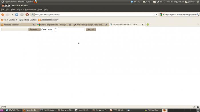 Hi Guys i have been struggling with this script for almost a week now. I am trying to get images uploaded into a MySQL DB with a php script. this is the script that does it for me. add.html ( just the page where an image is selected to be uploaded) <form enctype="multipart/form-data" action="insert.php" method="post" name="changer"> <input name="MAX_FILE_SIZE" value="1024000" type="hidden"> <input name="image" accept="image/jpeg" type="file"> <input value="Submit" type="submit"> HTML: then insert.php ( the main script) <?php // Create MySQL login values and // set them to your login information. $username = "####"; $password = "####"; $host = "#####"; $database = "binary"; // Make the connect to MySQL or die // and display an error. $link = mysql_connect($host, $username, $password); if (!$link) { die('Could not connect: ' . mysql_error()); } // Select your database mysql_select_db ($database); // Make sure the user actually // selected and uploaded a file if (isset($_FILES['image']) && $_FILES['image']['size'] > 0) { // Temporary file name stored on the server $tmpName = $_FILES['image']['tmp_name']; // Read the file $fp = fopen($tmpName, 'r'); $data = fread($fp, filesize($tmpName)); $data = addslashes($data); fclose($fp); // Create the query and insert // into our database. $query = "INSERT INTO tbl_images "; $query .= "(image) VALUES ('$data')"; $results = mysql_query($query, $link); // Print results print "Thank you, your file has been uploaded."; } else { print "No image selected/uploaded"; } // Close our MySQL Link mysql_close($link); ?> Code (markup): now heres the tricky part(maybe just for me) there needs to be a extra box in the add.html so that the person uploading the image can insert(type) in the customer number(lets say its "1") then the script needs to go and where the id(Primary Key) is equal to what the user entered("1") needs to go upload it in that row. Any help would be appreciated. Cheers