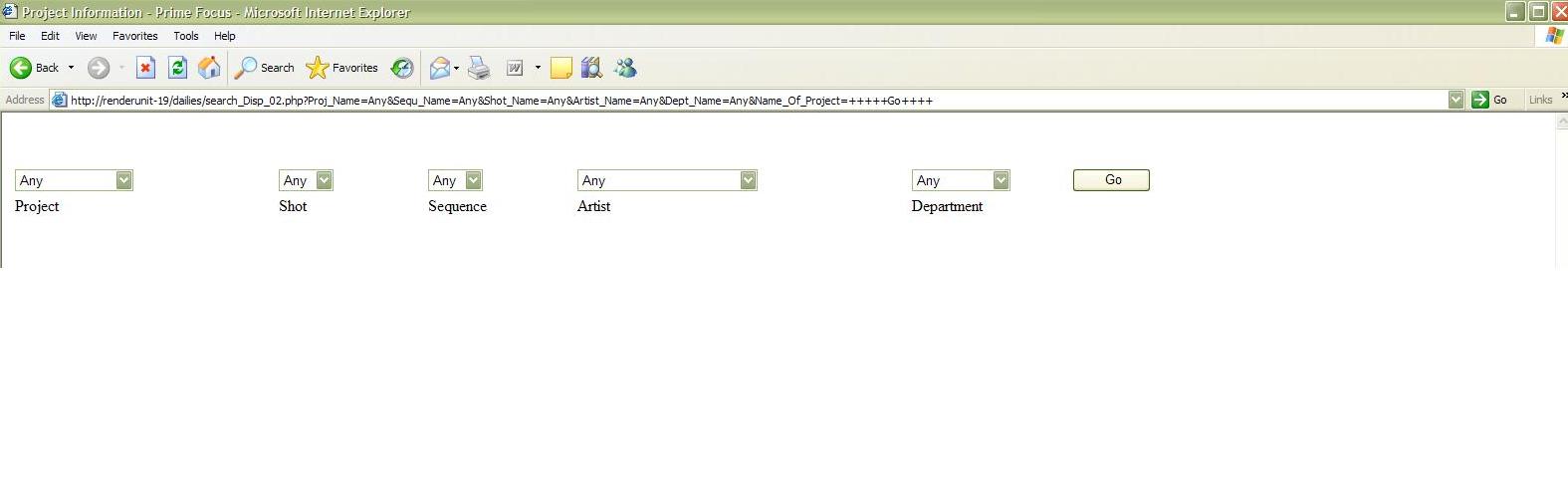 Hi, Find attached a page image. Initially, when user goes to the link, without this code the page shows not needed display. Whereas what is needed is when I press the button go. So, I included that in the if condition. However, it is not working as needed. How is it possible to see it working and be happy and make others happy here. $currentPage = $_SERVER["PHP_SELF"]; if (!isset($_GET['Submit'])) { $host = $_SERVER['HTTP_HOST']; $uri = rtrim(dirname($_SERVER['PHP_SELF']), '/\\'); $pagename = 'search_Disp_03.php?Proj_Name=Any&Sequ_Name=Any&Shot_Name=Any&Artist_Name=Any&Dept_Name=Any&Name_Of_Project=Go'; # header("location: http://renderunit-19/dailies/search_Disp_03.php?Proj_Name=Any&Sequ_Name=Any&Shot_Name=Any&Artist_Name=Any&Dept_Name=Any&Name_Of_Project=Go"); header("location: http://$host$uri/$pagename/"); exit; }