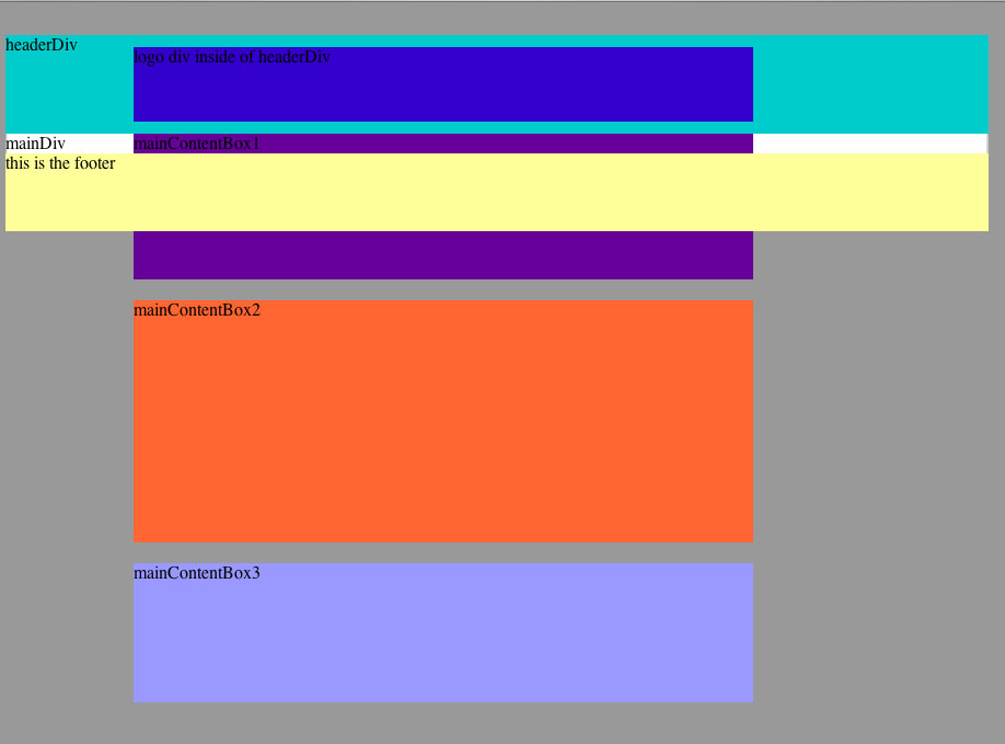 <!DOCTYPE html PUBLIC "-//W3C//DTD XHTML 1.0 Strict//EN" "http://www.w3.org/TR/xhtml1/DTD/xhtml1-strict.dtd"> <html xmlns="http://www.w3.org/1999/xhtml"><head> <meta http-equiv="Content-Type" content="text/html; charset=iso-8859-1" /> <title>Untitled</title> <style type="text/css"> * { margin:0; padding:0; } #container { width:898px; margin:0 auto; } .noflow { position:absolute; } #header { background-color:#0CC; /* choppers? */ padding:11px 8px; } #header .logo { background:#30C; width:566px; height:68px; margin:0 auto; } #content { background:#090; padding:0 8px; } .content_box { width:566px; margin:0 auto; } #content_box1 { background:#609; height:133px; margin-bottom:19px; } #content_box2 { background:#F63; height:221px; margin-bottom:19px; } #content_box3 { height:127px; background:#99F; } #footer { padding:11px; background:#FF9; } </style> </head><body> <div id="container"> <div id="header"> <div class="noflow">headerDiv</div> <div class="logo">logo div inside of headerDiv</div> </div> <div id="content"> <div class="noflow">mainDiv</div> <div id="content_box1" class="content_box"> maincontent_box1 </div> <div id="content_box2" class="content_box"> maincontent_box2 </div> <div id="content_box3" class="content_box"> maincontent_box3 </div> </div> <div id="footer"> this is the footer </div> </div> </body></html> Code (markup): I tossed the label texts in absolute positioned containers so as not to disturb the layout - you do plan on deleting that stuff on the live site, right? I used the margins because I was unsure if you were adding side columns or not - if so, you'd want to use a float based layout. Absolute positioning is NOTHING but a headache - oh, and I'd also axe the fixed-height containers in the content... that's just bad policy.