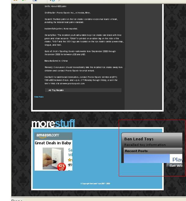 Hi, I visited ban lead toys Nice site and content. Keep up the good work. I like that you are giving consumers the info they need to follow through after you've notified them of the possible dangers. I like the theme -even though I prefer light themes - yours is not too dark at all. I would like to let you know about possible browser problems. I am using IE7 winxphome resolution 1366 wide, and I had some ugliness in your footer. I don't know if you meant the "box" to be out of the border, but here's a screenshot for you to analyze. I would recommend you do some traffic building through AdEngage. Use a catchy title and an image