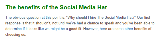 Get someone to proof read all the copy on your site. A friend flunked a job interview because the employer deemed him too wealthy to need that particular job. If Sameer is so wealthy why is working? Why are you using tables instead of divs for layout? and why no women on your team? The link for "recent work" doesn't go anywhere What is a "Social Media Hat"? I get that the domain has all the keywords in it, but don't use that as the company name, it's clumsy and looks spammy. "Ahmad Social Media" looks more authentic. https://socialmediahelper.agency/our-team/ Get someone to grab their phone and take photos in a studio style setting, or somewhere where you're all together. One guy is in a taxi! This guy looks great (but without sunglasses) but all the other photos, ugh! This one might do but it's out of focus and low quality Your contact us page needs to have phone numbers and email addresses, and preferably a physical address too. These days with everyone working from home it would be tempting not to have an actual office but customers need to have a way to contact you that isn't filling in a contact form.