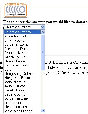Hello frndz, Please any one tell me the html form code with currency select and custom amount value options for paypal donate Here im providing sample paypal donate buttom html form code ..which was grabbed from paypal.com <form action="https://www.paypal.com/cgi-bin/webscr" method="post"> <input type="hidden" name="cmd" value="_xclick"> <input type="hidden" name="business" value="you@yourdomain.net"> <input type="image" src="https://www.paypal.com/en_US/i/btn/btn_donateCC_LG.gif" border="0" name="submit" alt="PayPal - The safer, easier way to pay online!"> <img alt="" border="0" src="https://www.paypal.com/en_US/i/scr/pixel.gif" width="1" height="1"> </form> Code (markup): How to add currency options(USD,AUD,GBP etc.,) with dropdown menu and custom amount value column(to enter money value "25"etc.,) into above code ... Such that the entry details should be available at redirected paypal site page... My question screenshot is below...the code i wanted to ask u is like this Plzz anybody help me!!!