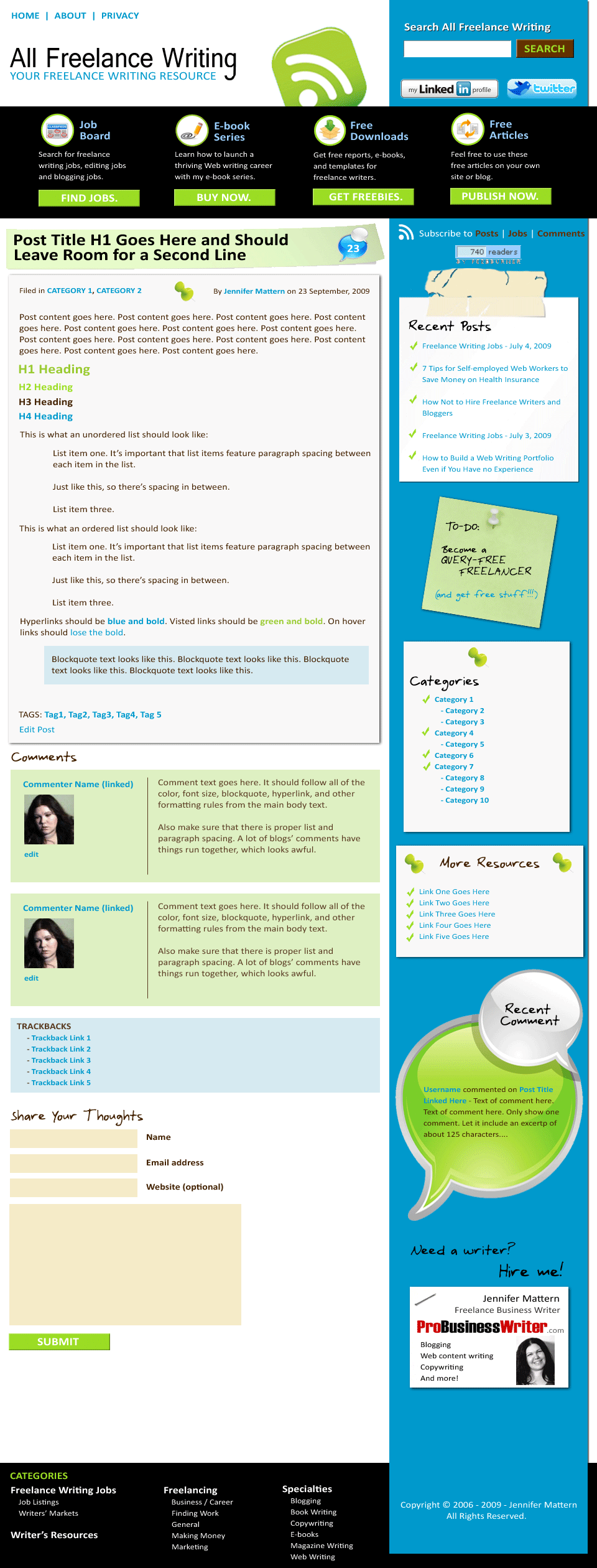 Yes, I'm expecting that. Once it's coded, I can always further optimize and remove images if needs be. I can hack a theme to pieces - just don't have the ambition to start from scratch. I wouldn't normally go with this many required images, but given that it's for a creative audience and the blog's reasonably big in its niche, I wanted something visually a bit more fun and something that would set it apart than the other freelance writing blogs currently out there. Seems a few people are missing the preview link in the first post, so I'm going to go paste in a screenshot (hope that helps those who need a better idea of the project). I do know bullets aren't shown on the image above. They are included in the second .psd though (for the homepage).