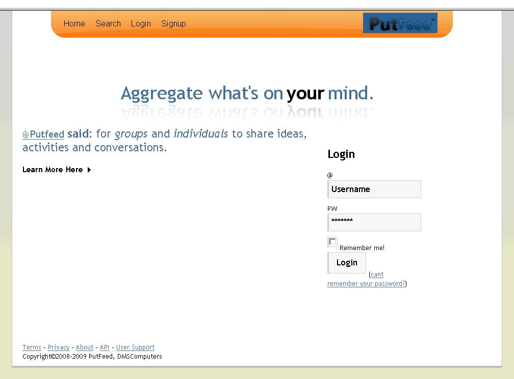 Hello Everyone! I've just released this site to the public and completely redesigned it. I need some opinions on the design as well as the user-experience. I'm open to questions, thoughts, ideas and any improvements you suggest. PutFeed.com : Aggregate what's on your mind.â„¢ Please don't nit-pick little things like, "the text is too far this way or too far that way" I'm still touching things up. I want to know your overall impression! You can find me here: Putfeed.com/ClintonSkakun Thanks!