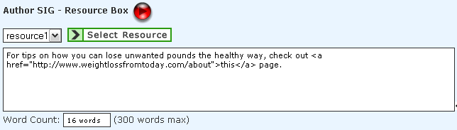 In the 'Author SIG - Resource Box' while submitting an article at EZA, do I keep one line (having a link to my site) in each of the 3 resources? I pasted a line with 'resource1' selected, then clicked 'Select Resource' and pasted another line in 'resource2'. However, when I go back to resource1, the text is not present. Is it ok to paste 3 lines (having 3 links) in resource1?