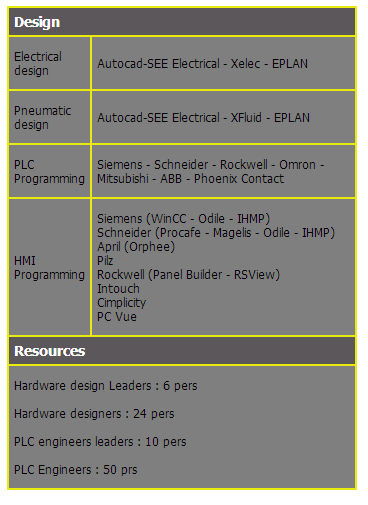 Here is your table: <html> <head> <style> #designTable { font-family: tahoma, serif; font-size: 12px; width: 350px; border-spacing: 0px; background-color: #7f7f7f; border-collapse: collapse; } #designTable td { padding: 12px 5px; border: 2px solid #e9eb0e; } #designTable th { padding: 5px; font-size: 14px; border: 2px solid #e9eb0e; background-color: #5c575b; color: white; font-weight: bold; text-align: left; } </style> </head> <body> <table id="designTable"> <tr> <th colspan="2">Design</th> </tr> <tr> <td>Electrical design</td> <td>Autocad-SEE Electrical - Xelec - EPLAN</td> </tr> <tr> <td>Pneumatic design</td> <td>Autocad-SEE Electrical - XFluid - EPLAN</td> </tr> <tr> <td>PLC Programming</td> <td> Siemens - Schneider - Rockwell - Omron - Mitsubishi - ABB - Phoenix Contact </td> </tr> <tr> <td>HMI Programming</td> <td> Siemens (WinCC - Odile - IHMP) <br /> Schneider (Procafe - Magelis - Odile - IHMP) <br /> April (Orphee) <br /> Pilz <br /> Rockwell (Panel Builder - RSView) <br /> Intouch <br /> Cimplicity <br /> PC Vue </td> </tr> <tr> <th colspan="2">Resources</th> </tr> <tr> <td colspan="2"> Hardware design Leaders : 6 pers <br /><br /> Hardware designers : 24 pers <br /><br /> PLC engineers leaders : 10 pers <br /><br /> PLC Engineers : 50 prs </td> </tr> </table> </body> </html> Code (markup): Sent you my paypal address in case you want to pay me, Best regards, Duluman Edi.