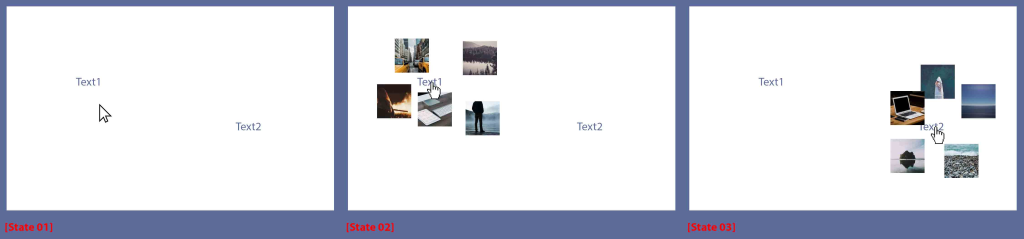 I would like that when a user hovers different words, that a random arrangement of thumbnails fades-in. Some caveats: thumbs should stay fairly close to the corresponding text. thumbs can overlap, but not fully. both the text and the thumb positions should be random on every page refresh text and thumbs shouldn't fall outside the screen. should be scalable (i.e.. I will have max. 10 texts and max. 10 thumbs for every text. the thumbs could spread concentrically if need be) See the attached image for an example of what I mean. And here's a fiddle of what I have so far: https://jsfiddle.net/2jddfsjad/ewk4dzLp/9/