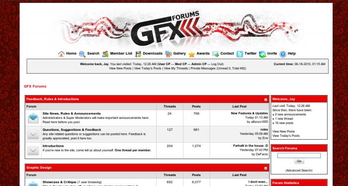 V1 located here. License: GNU GPL 3 Author: Jay Website: http://www.gfxforums.net Details: EvoBB V2 is a white and deep red theme with a beautiful red floral background. Included are custom smilies, buttons and modifications. Install ====================================== 1. Upload the evobb folder into your images directory. 2. Import EvoBB-theme.xml in admincp > templates & style > themes > import a theme. Demo N/A Download http://www.gfxforums.net/showthread.php?tid=2203