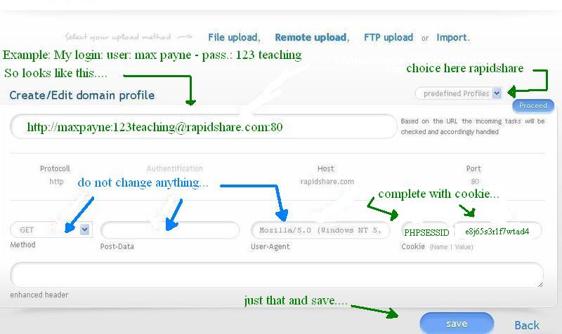 I'll give an example in firefox: Go to: Tools => Options => Privacy tab => select delete cookies (you will not delete anything, just enter) In the Cookies tab, you will search for rapidshare. When found, double click and search for "PHPSESSID" Double click the cookie PHPSESSID. Below the tab will look like this: Name: PHPSESSID Value: e8j65s3r1f7wtad4 (only example) Server: www.rapidshare.com Path: / Send: all types of connections Validity: until you exit the application look at the image and see how to complete .. Problem: - For each host may have differences in the cookie name. I teach the standard. I used to wupload, filesonic ... In the megaupload was "user" You have to figure out the name of the cookie rapidshare (may be the same name (PHPSESSID), I do not know) - Some hosts, cookies have different names at each login. (wupload changed) You will then need to update the remote profile (PHPSESSID) every time you use. Good Luck Buddy!
