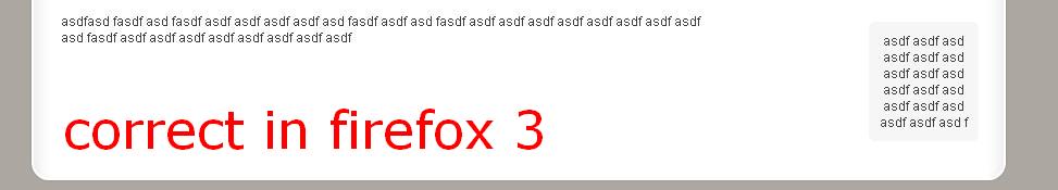 Hi, I have CSS/html code that right aligns a column which works for Firefox 3.0 but not for IE6 (see attached screenshots). Do you know what I need to change to have it work for IE6? ----- HTML ------ <table><tr> <td style="width: 600px; vertical-align: top;"> asdfasd fasdf asd fasdf asdf asdf asdf asdf asd fasdf asdf asd fasdf asdf asdf asdf asdf asdf asdf asdf asdf asd fasdf asdf asdf asdf asdf asdf asdf asdf asdf </td> <div class="rules" style="background-color: #f6f6f6; text-align: center; float:right;"> <div class="inner" style="color: #3f3f3f; font-size: 12px;"><span class="corners-top"><span></span></span> asdf asdf asd <br /> asdf asdf asd <br /> asdf asdf asd <br /> asdf asdf asd <br /> asdf asdf asd <br /> asdf asdf asd f <span class="corners-bottom"><span></span></span> </div> </div> </tr></table> ---- rules CSS ---- div.rules { background-color: #ececec; color: #bcbcbc; padding: 0 10px; margin: 10px 0; font-size: 1.1em; }