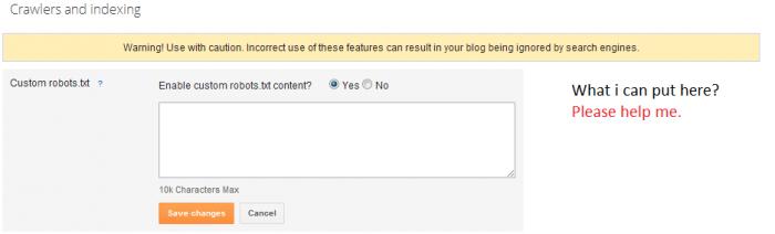 In order to allow all robots access just enter User-agent: * Disallow: Sitemap: http://www.domainname.com If you are new to robots.txt don't play with the custom field, leave it as it is and as jose mentioned do look at the webmaster link for more information on robots.txt