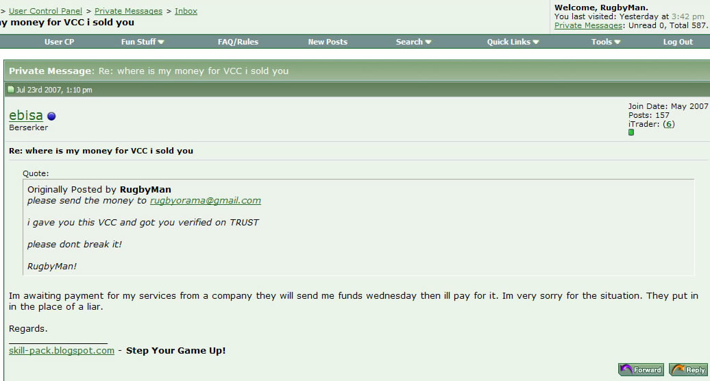 Warning!!! Do not trade with ebisa. He scammed me a vcc i have sent him to verify paypal and he told me that when he is verfied he will pay me the money! Cheap scammer, Dont do anything with him or u will lose ur money!