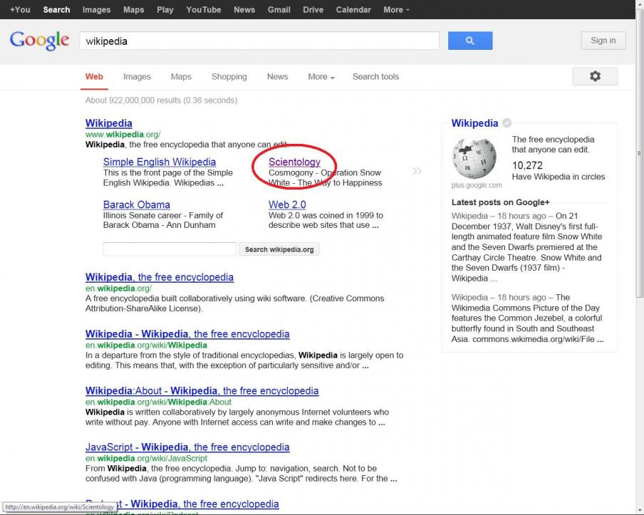 I noticed that if you search for "Wikipedia" on Google.com you get this, every time: WTH is going on??? Has Scientology bought that spot from Wikipedia? For those of you who are unaware, Scientology is a ruthless corporate giant passing itself off as a "Church". It acquired nonprofit status by infiltrating the IRS.