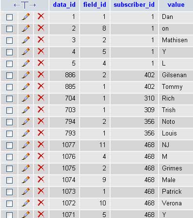 Hey guys, I have a database that I can't edit... a screenshot of it is attached. This db has a unique 'subscriber_id' for each person, and it stores their first name under 'field_id' 1 and the last name under 'field_id' 2.... if I'm saying that correctly. The attached image should help explain that. I want to query this database so that it outputs the first name and last name, then a <br> So far I have the following code (very simple): <?php $con = mysql_connect("localhost","xxx","xxx"); if (!$con) { die('Could not connect: ' . mysql_error()); } mysql_select_db("pintmeis_pmsignup", $con); $result = mysql_query("SELECT `pm_subscriber_data`.* FROM pm_subscriber_data WHERE field_id='1'"); while($row = mysql_fetch_array($result)) { echo $row['value']; echo "<br />"; } mysql_close($con); ?> PHP: And this correctly displays the first name. But I have no idea how to make it display the last name. I tried this (and other variations of it): WHERE field_id='1' OR field_id='2' but this outputs the first name and last name on separate lines, and it orders the names wrong in many cases. I'm at a loss here... any help would be much appreciated. Thanks so much! I have this code executed on this page if it helps: http://www.pintmeisters.com/subscribers.php