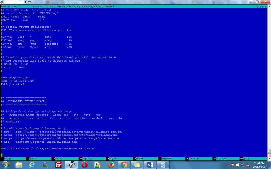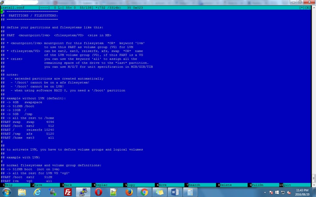Holah Im having a problem here , im trying to set up a dedicated server so i can install SolusVM on it for management . on the tutorial is says that i must partition the hard drives for LVM but i have no ideas what values i must set there on that file . Since i can't copy and paste the contents of the file the only thing i can do is post a screenshot . The requirements that SolusVM wants are as follows / 80GB+ (XEN templates & iso's will be stored in /home/solusvm/xen) SWAP 4GB max (Virtual servers won't use the host swap) Logical Volume Group (LVM) remaining space (Logical Volume Group Only, SolusVM will create the logical volumes for the virtual servers inside this group) We suggest a PE size of 32MB or above. Code (markup): The question is what values do i change on the screenshots attached here . If they are any server masters here, your assistance will be greatly appreciated