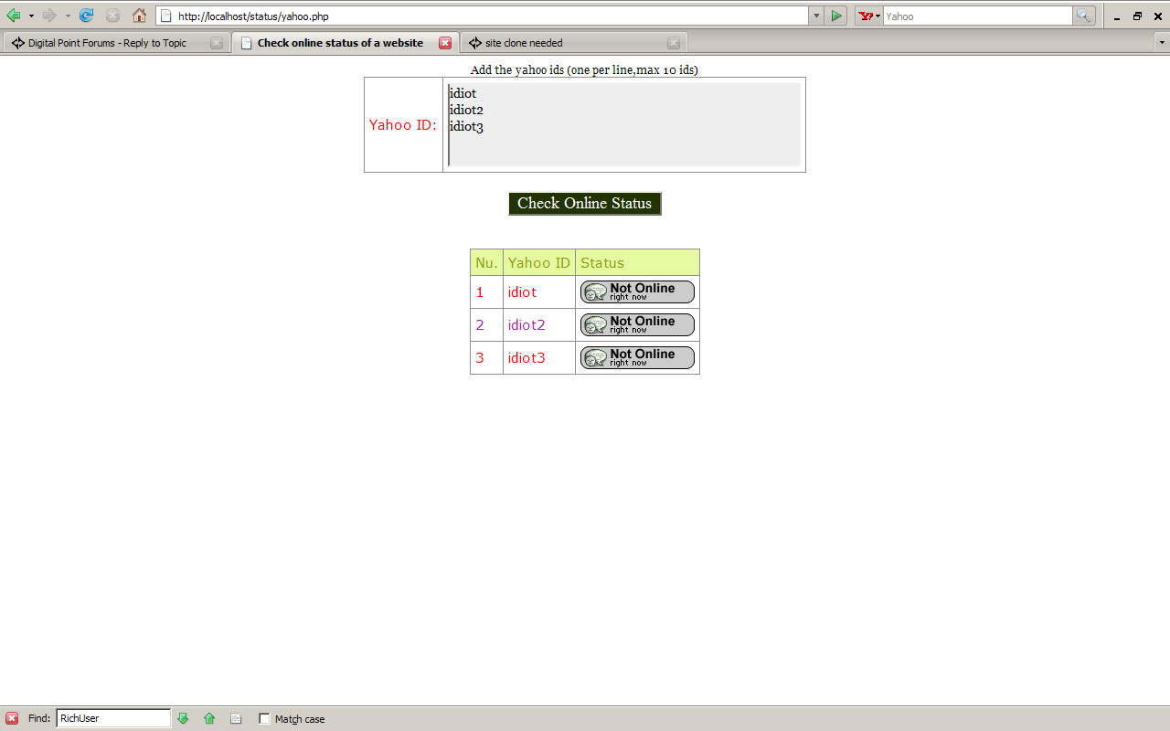 No , it's not easy work . take a close look at that website. It's not only checking the user status from http://profiles.yahoo.com/alyna_bejusca?intl=us&os=win&ver=8.1.0.421 it's also checking if the user is invisible or not! that's a very hard coded hack into yahoo , that's making that website very unique! You will need to connect to the server for that , via CURL , known the Yahoo API , and do some hacks to the other person computer, to see if he is invisible .... or he is just not there. Also , yahoo will very soon fix that bug, and this person script will be stopping working for ever. Also he want to detect if somebody if invisible on MSN ,etc? that's like impossible ... I just wanted to alert everybody that this is not an easy project as you might think of it! It's a very hard one! he said 50 $ because lot's of people from digitalpoint didn't tested that website yet, and they do not known that it's also detecting invisible status on Yahoo messenger... they only think they need to get the data from profiles.yahoo.com , to detect if a user is online/offline but this is only if that user put you on ignore or you are on the sthealth mode!
