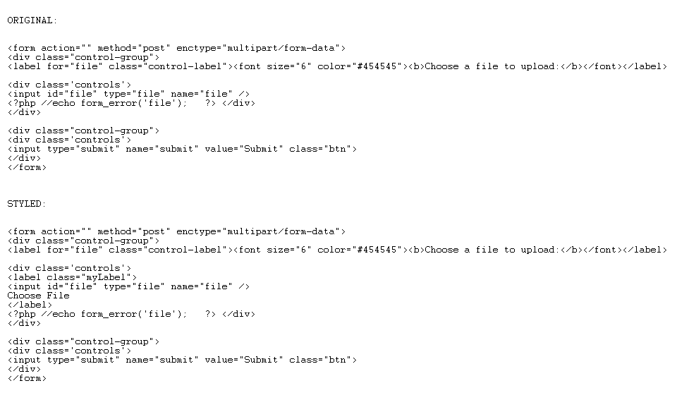 I'm using an Upload Script, and I've been working on trying to style the 'Choose File Button' (input file button) which was a challenge to be styled for multiple browsers, but finally works with Google, IE and FF. However, now that I've successfully styled the input file button, when a file is now chosen, the chosen file name no longer appears, prior to Submit. I've attached an image of the code changes I made, plus some CSS styling, and this addition: label input[type="file"] { position: fixed; top: -1000px; Code (markup): Any suggestions/ideas/remedy on how to get the chosen file to show (or something to show an action has taken place - like a message tha says "File Selected" possibly) will be appreciated