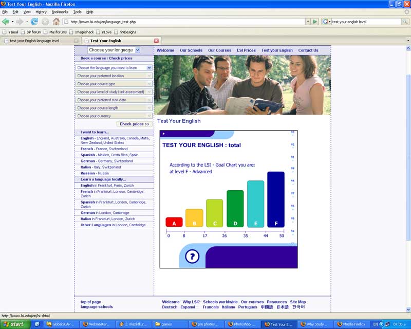 Hello people ! I have found this small online exam that helps you to test your English level: http://www.lsi.edu/book/tests.php?Redirect=/en/language_test.php I thought it would be a good idea to share it with you and see your results I got F (advanced) Grade