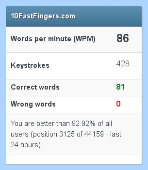 I probably could type a little faster if i practiced a few more times. But this speed is not practical. Also, i corrected some of my errors right as i made them, this slowed my WPM down but also gave me 0 errors.