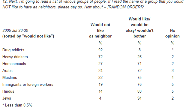 No, you are trying to use a public opinion poll to make what you feel is a statement of fact( argumentum ad populum). Your argument is, because 40 something percent of Europeans feel Israeli's exploit the holocaust, it must be true. My response, since you clearly didn't catch it, was to use your same line of reasoning, logical fallacy and all, against you. I posted a poll that showed nobody wants an Arab for a neighbor, therefore, Arabs must be horrible neighbors. Its the same line of reasoning that says Muslim = terrorist. Either both promote racial hatred, or neither do. Take your pick.