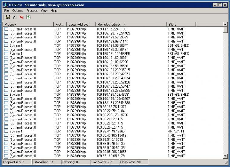 Hi there, I am running a ColdFusion server on a VPS to HostMySite.com and lately we are having strange problems with it. Every few minutes the server is not responding even if we restart the services - IIS and ColdFusion - and even the whole system. HMS guys investigated the problem and they discovered that every connection to the server is openening multiple sockets for a single IP address (every single visitor). Here is the full message from HMS technician, do you have any previous experience related to this? I've been doing some advanced monitoring and troubleshooting of your VPS over the last 24 hours. It is important to understand that the issue you're actually experiencing is related to TCP sockets. Every connection to your server opens a socket and sometimes multiple sockets for an individual IP (visitor). I opened the site http://www.viaromania.eu/ and instantly there were 7 connections established from our IP address. C:\Documents and Settings\hmsadmin>netstat -ano | find "209.41.163.23" TCP 76.12.37.79:80 209.41.163.23:9563 ESTABLISHED 4 TCP 76.12.37.79:80 209.41.163.23:21164 ESTABLISHED 4 TCP 76.12.37.79:80 209.41.163.23:26819 ESTABLISHED 4 TCP 76.12.37.79:80 209.41.163.23:36833 ESTABLISHED 4 TCP 76.12.37.79:80 209.41.163.23:37624 ESTABLISHED 4 TCP 76.12.37.79:80 209.41.163.23:39566 ESTABLISHED 4 TCP 76.12.37.79:3389 209.41.163.23:2577 ESTABLISHED 141388 After just browsing around a few pages on the site you can see how my connections are expanding. C:\Documents and Settings\hmsadmin>netstat -ano | find "209.41.163.23" TCP 76.12.37.79:80 209.41.163.23:2852 ESTABLISHED 4 TCP 76.12.37.79:80 209.41.163.23:2900 ESTABLISHED 4 TCP 76.12.37.79:80 209.41.163.23:11014 ESTABLISHED 4 TCP 76.12.37.79:80 209.41.163.23:11178 TIME_WAIT 0 TCP 76.12.37.79:80 209.41.163.23:14107 ESTABLISHED 4 TCP 76.12.37.79:80 209.41.163.23:14248 ESTABLISHED 4 TCP 76.12.37.79:80 209.41.163.23:17177 ESTABLISHED 4 TCP 76.12.37.79:80 209.41.163.23:17606 ESTABLISHED 4 TCP 76.12.37.79:80 209.41.163.23:17930 ESTABLISHED 4 TCP 76.12.37.79:80 209.41.163.23:23460 ESTABLISHED 4 TCP 76.12.37.79:80 209.41.163.23:24594 TIME_WAIT 0 TCP 76.12.37.79:80 209.41.163.23:25191 TIME_WAIT 0 TCP 76.12.37.79:80 209.41.163.23:25507 ESTABLISHED 4 TCP 76.12.37.79:80 209.41.163.23:32301 ESTABLISHED 4 TCP 76.12.37.79:80 209.41.163.23:33591 ESTABLISHED 4 TCP 76.12.37.79:80 209.41.163.23:37338 ESTABLISHED 4 TCP 76.12.37.79:80 209.41.163.23:38404 TIME_WAIT 0 TCP 76.12.37.79:80 209.41.163.23:45140 ESTABLISHED 4 TCP 76.12.37.79:80 209.41.163.23:49734 ESTABLISHED 4 TCP 76.12.37.79:80 209.41.163.23:53755 ESTABLISHED 4 TCP 76.12.37.79:80 209.41.163.23:55735 TIME_WAIT 0 TCP 76.12.37.79:3389 209.41.163.23:2577 ESTABLISHED 141388 Over the last 2 days there are 205 coldfusion-out logs and they are all full of the same error: java.net.SocketException: Software caused connection abort: socket write error Normally when we see this we'll make a few registry adjustments that allow for more socket connections and a shorter time to live on existing socket connections. However in your case all of the registry adjustments have already been set. MaxUserPort 65534 TcpNumConnections 200 connections TcpTimedWaitDelay 30 seconds I adjusted the TcpNumConnections to 500, see if this alleviates the issue. Note that allowing 500 Tcp Connections is not necessarily a good idea as this amount of traffic could theoretically bring down your server. I created a scheduled task that executes every 60 seconds in which it counts the connections on port 80 and writes it to the file netstat.txt on the desktop. After logging for the last 24 hours it has gone over the 500 TCP connections 19 times all between 2:21pm and 2:40pm 2:21 PM 1367 2:22 PM 1423 2:24 PM 1684 2:25 PM 1466 2:26 PM 1867so 2:27 PM 1250 2:28 PM 854 2:29 PM 796 2:30 PM 799 2:31 PM 794 2:32 PM 816 2:33 PM 730 2:34 PM 662 2:35 PM 524 2:36 PM 531 2:37 PM 539 2:38 PM 551 2:39 PM 551 2:40 PM 522 So this is pretty good news. This means your site over the last 24 hours only had 19 minutes of issues due to TCP connections. Please, post your messages if you know why so many sockets are opened for every single IP and if this is a normal behaviour. Greetings, Adrian.