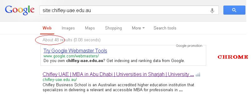 Hi, When I check index pages of my website in Google using firefox browsers it shows 40 links. But, When I check on chrome i get 49 links. I have attached the screen shots here. please check and tell me the reason why it happens.