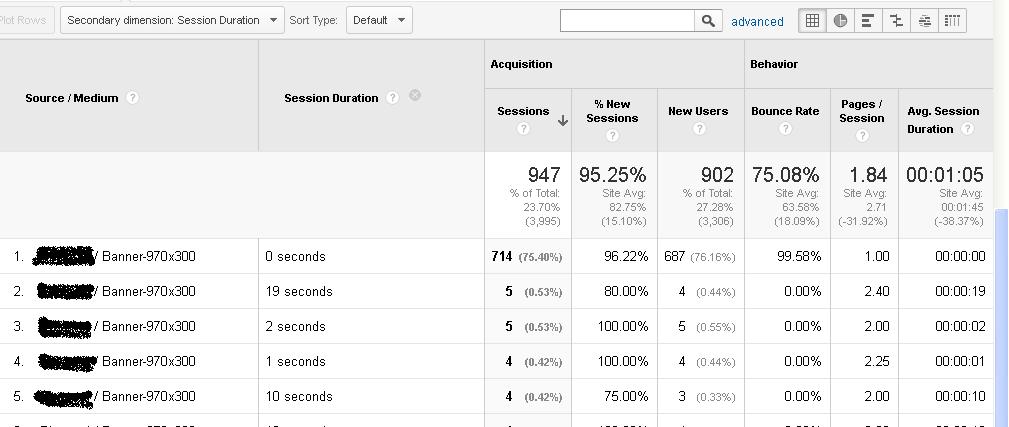 Hi there, I have the following issue (in Analytics) with Session Duration and bounce Rate concerning my Banners. So, when I click on Banner (in All Traffic) and then click on Users - Session Duration (in Secondary Dimension) then I have the following data which I can not figure out (I have attached the Print Screen of it). The 75% (714 users of 974 total) of all Sessions (clicks) on my Banner have been on my site (that's Session Duration) for a period of 00:00:00 with a Bounce Rate of 99.6% (100%). Isn't that strange? Can anybody explain it, please? I suspect it might be some illegal activites, to shine up the No. of clicks on Banner, or maybe it's just the Analytics tracking issue (which I don't understand). Thank you, Lambo