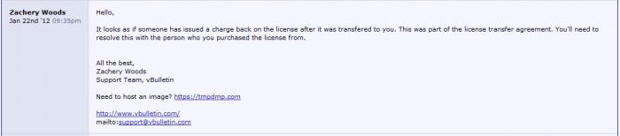 Dear Mr. Devis Demkollari (devisdemkollari@yahoo.com) First you need to know about vBulletin's policy, that once a license transferred it can't be transfer more, and also after the transfer you've got new customer id and new password which just for you, i don't have a chance (and ofcourse i don't need to do that) to steal your license. Please have a look @ vBulletin.com about their policy, again and carefully before you say anything stupid. One again i need to let you know that, after a transfer (our deal in this case) i dont have any responsibility on your license, because the transfer was process manually by vBulletin's staff, a real person, not automatic, and i have to prove a lot of proof that i'm the legal owner of this license and this license is legal, and eligible for transfer. Once this transfer processed, the license is completely yours, you have to take care about it and i don't know what you did with your license. Are you using it with no copyright? Are you violence vBulletin's policy? I don't know, that is your problem, you can't blame it to me. If this license is illegal or something it's been not eligible for transfer, and not living for 2 months after that. Thank you for understanding,
