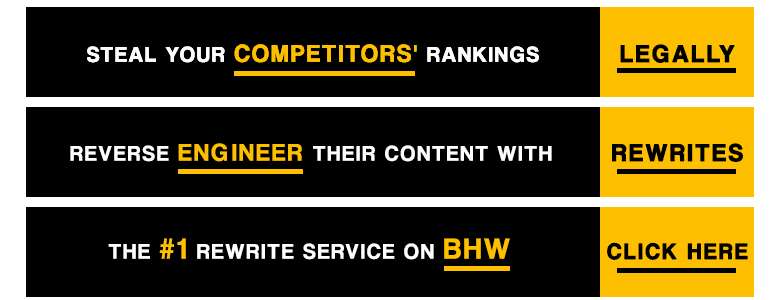 I need a banner with the same dimensions and colors as https://i.imgur.com/uIQIGDz.png BUT... with the following changes FLASHING GIF BANNER - 3 PANELS IN ONE .GIF Rules for GIF the refresh rate on any graphic or text within the gif should not be less than 3 seconds. Annoying or flashing images are NOT acceptable, that includes text flashing, and text flying in at any position, glitch effects, flash is NOT accepted, the file size of any banner should not exceed 200KB, ideally your banner size should be 100KB or less for loading speed Panel 1: STEAL your competitors' Rankings LEGALLY Panel 2: Reverse Engineer Their Content with REWRITES Panel 3: The #1 REWRITE SERVICE on BHW CLICK HERE Payout is $5 Contest ends once someone posts a banner I like in this thread