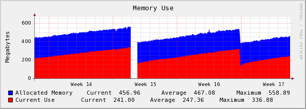 I have a VPS with 384 MB RAM where I host some PHP sites with constant traffic. I don't have diggs or other kind of traffic spikes going on. Here is my problem: the memory used keeps increasing CONSTANTLY over a week or two, then the VPS gets slow and the hosting company does something to reset its memory back again. I'll attach a graph to see exactly what I mean. Is this my fault or the server (VPS) is not configured properly? I'm thinking that if this would be caused by my websites then there should be daily increases (for peak hours) not a constant one over an entire week. The VPS has a default LAMP setup and it is managed by the hosting company.