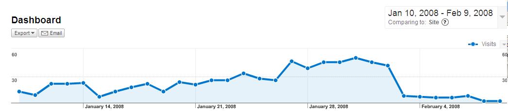 Could you please take a look at this screenshot and let me know your guess on what happened with the site? I started getting more SE traffic, then it suddenly tanked. I know it's only been a week or so, but do you think it will come back? It's a site that pulls ebay rss feeds and displays them. I just recently added link cloaking, so none of the links actually point to ebay any more.