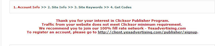 right after i registered in clicksor netwrok i suppose to inter their dashboard and waiting them to approve my website but No, i got this message instead : Thank you for your interest in Clicksor Publisher Program. Traffic from your website does not meet Clicksor minimum requirement. We recommend you to join our 100% fill rate network - Yesadvertising To register an account, please go to yesadvertising .com/publisher so what that means they don't even know what website i just entered , and i changed my email and the website but still had this message. just to keep in mind this is my first registration on clicksor i never visit this website before in my whole life.