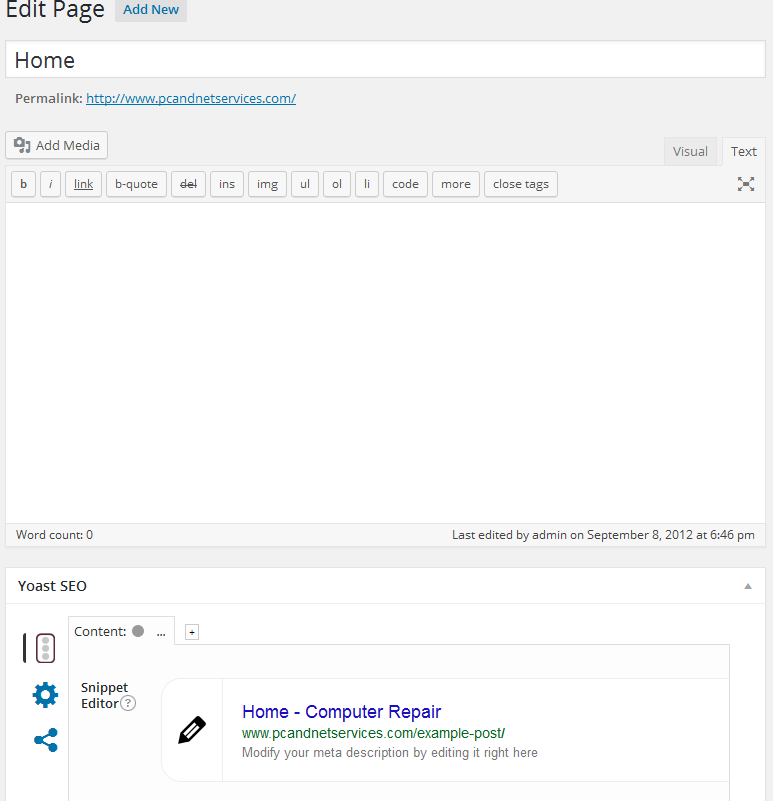 So guys, I am ready to start with the HOME page SEO on my new theme but my WP theme's home page is not set up like a regular theme: http://www.pcandnetservices.com/ Each section of that page is merely links to another full page or widget so when I go into my dashboard's Pages>HOME<Edit page there isn't any content showing as the attached image shows. So the problem is how can I edit the HOME page's description, titles e.t.c please? I can use my "Services" page as the HOME page but I want visitors to see the main page first as it shows everything at a glance of what my entire site is about, any ideas please?