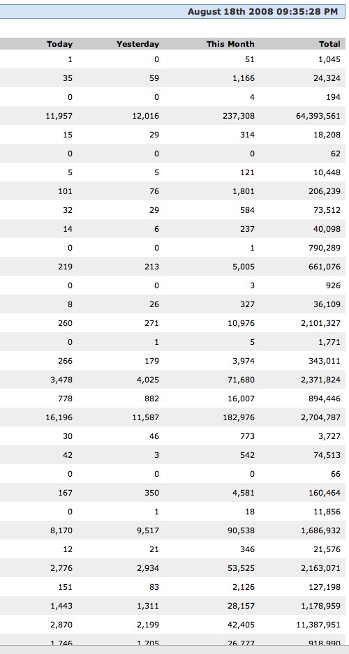 Okay, I am curious about what type of stats others have on their sites. I happen to like StatCounter. It is easy, free, and I think it keeps pretty good stats. I am going to post some pics of my stats, without site names or URLS. If others want to do the same cool. I am happy to tell what type of site these are if anyone has questions. Obviously, I have some dogs and some nice ones that bring me consistent traffic. I am a very part time webmaster, although I have lots of sites. I have a full time job, a wife and baby, and play way to much in DP P&R. I spend maybe 1 hour/per month on my sites though I keep telling myself to spend more time. Mostly all of my sites are the set it and forget it type. Many are celebrity sites. Easy traffic, low income earners. I hope the images stay up. If not, I will repost. Yea, I had a couple glasses of wine and was trying to find a way to waste more time on something that wont make me money - egro this thread. I hate posting images! Okay, added some, but I wanted full size in the thread. I will try to get that done.