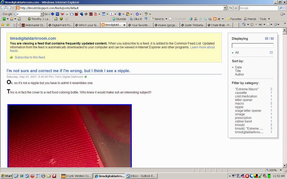 thanks for the tip-off Darren...what browser? the feed reacts differently than it used too...not sure if blogger changed it or what...nor am I savy enough to know what to look for as far as changes. this is what I can tell you, if I click on it in IE7 (see attached), it will take me to a stripped version of the post...it still contains all the text and images if I were viewing it from this link: http://timsdd.blogspot.com/2007/05/im-not-sure-and-correct-me-if-im-wrong.html but obviously looks much different no background, or sidebars, etc.